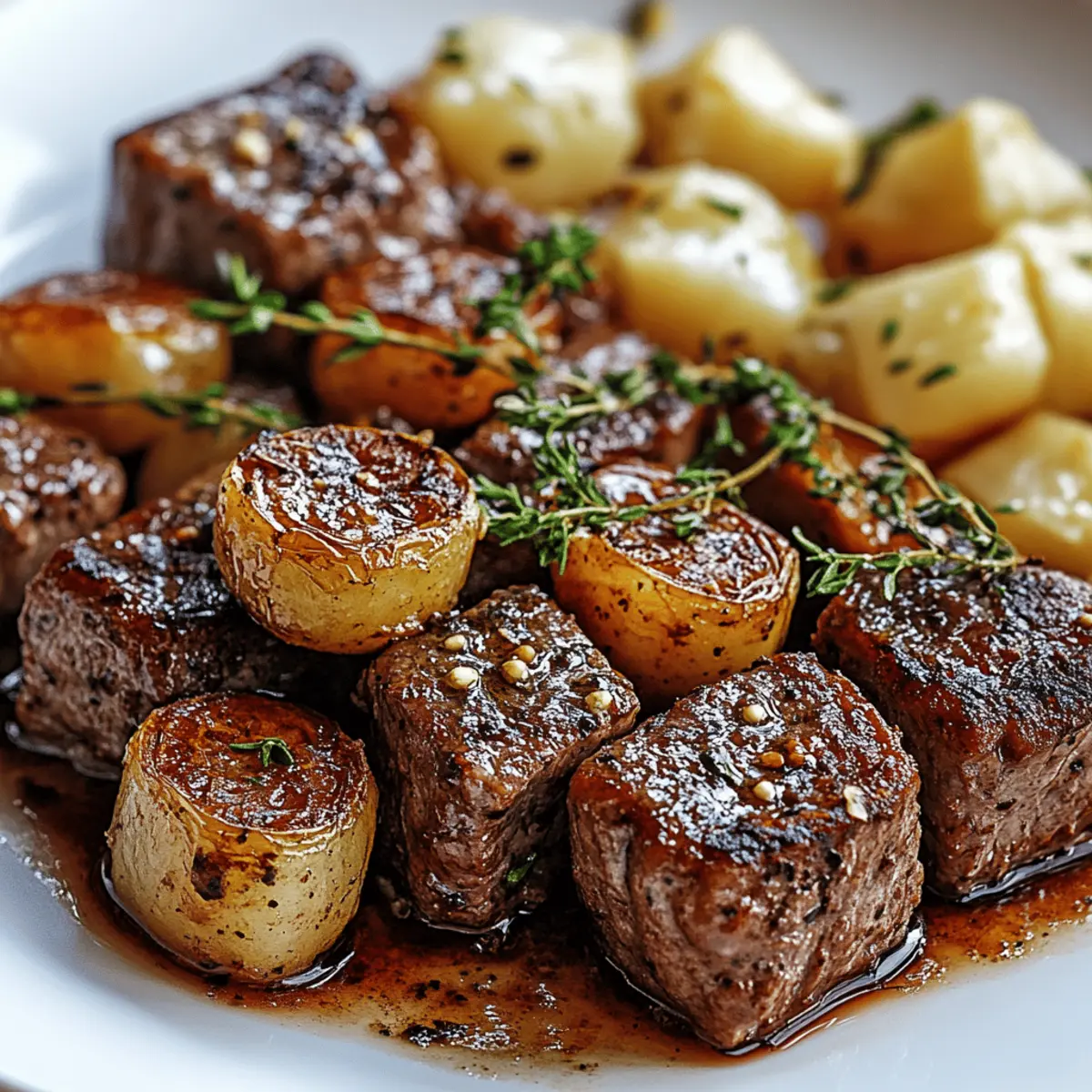 Return the seared steak cubes to the skillet, gently tossing them in the luscious garlic butter sauce for 1 to 2 minutes. Make sure every steak bite is coated evenly, absorbing the delightful flavors. Remove from heat, and your Garlic Butter Steak Bites and Potatoes are ready to be plated and enjoyed.